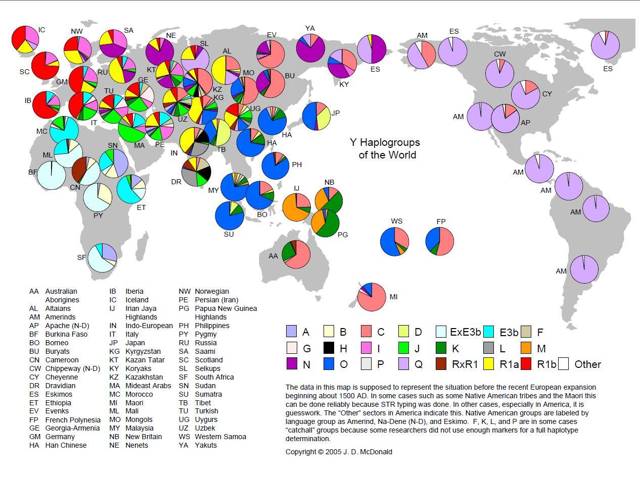 全世界男性Y染色体分布,从中也能读出人类迁徙的信息哟。一些细节的分析在下面讲。