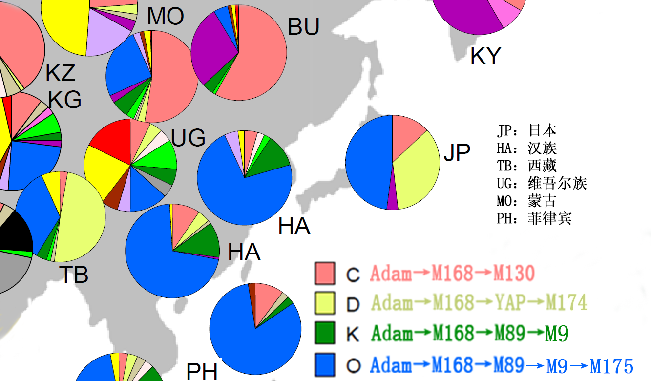 3.O型是K型中分化出来的一部分(M9→M175),在亚洲东部或者中部,之后O型也开始向东南亚扩散,途中的婆罗洲就有很高的比例。