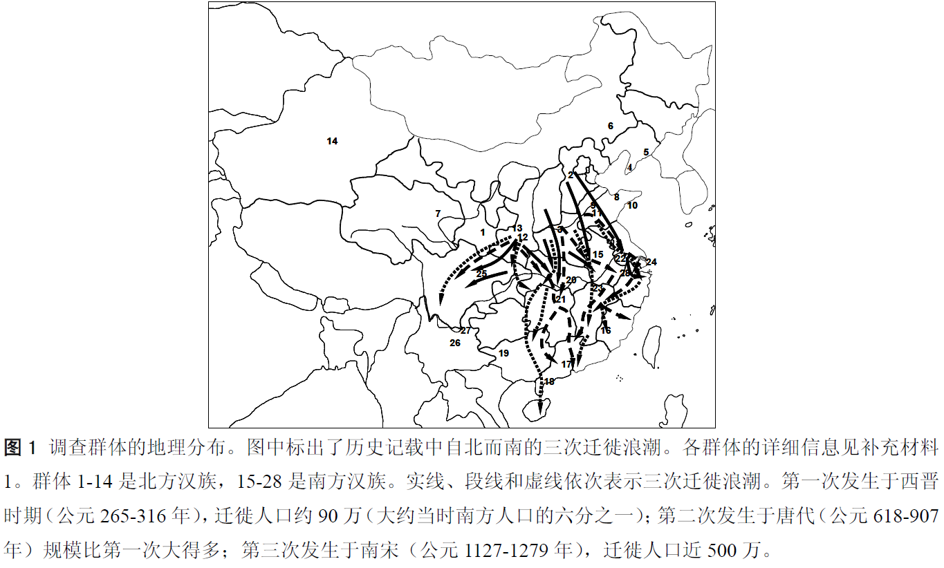 父系方面,南方汉族与北方汉族的Y 染色体单倍群频率分布非常相近;母系方面,北方汉族与南方汉族的线粒体单倍群分布非常不同。这表明南方汉族的群体混合过程有很强的性别偏向。