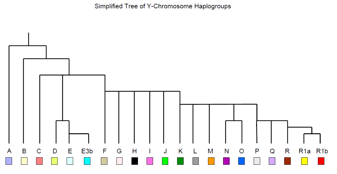 上图是从A到R各种类型的Y染色体,从A到R是根据他们的古老程度(分化出的时间)来编次序的。