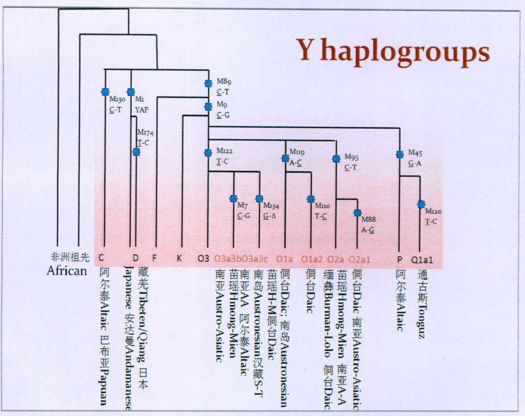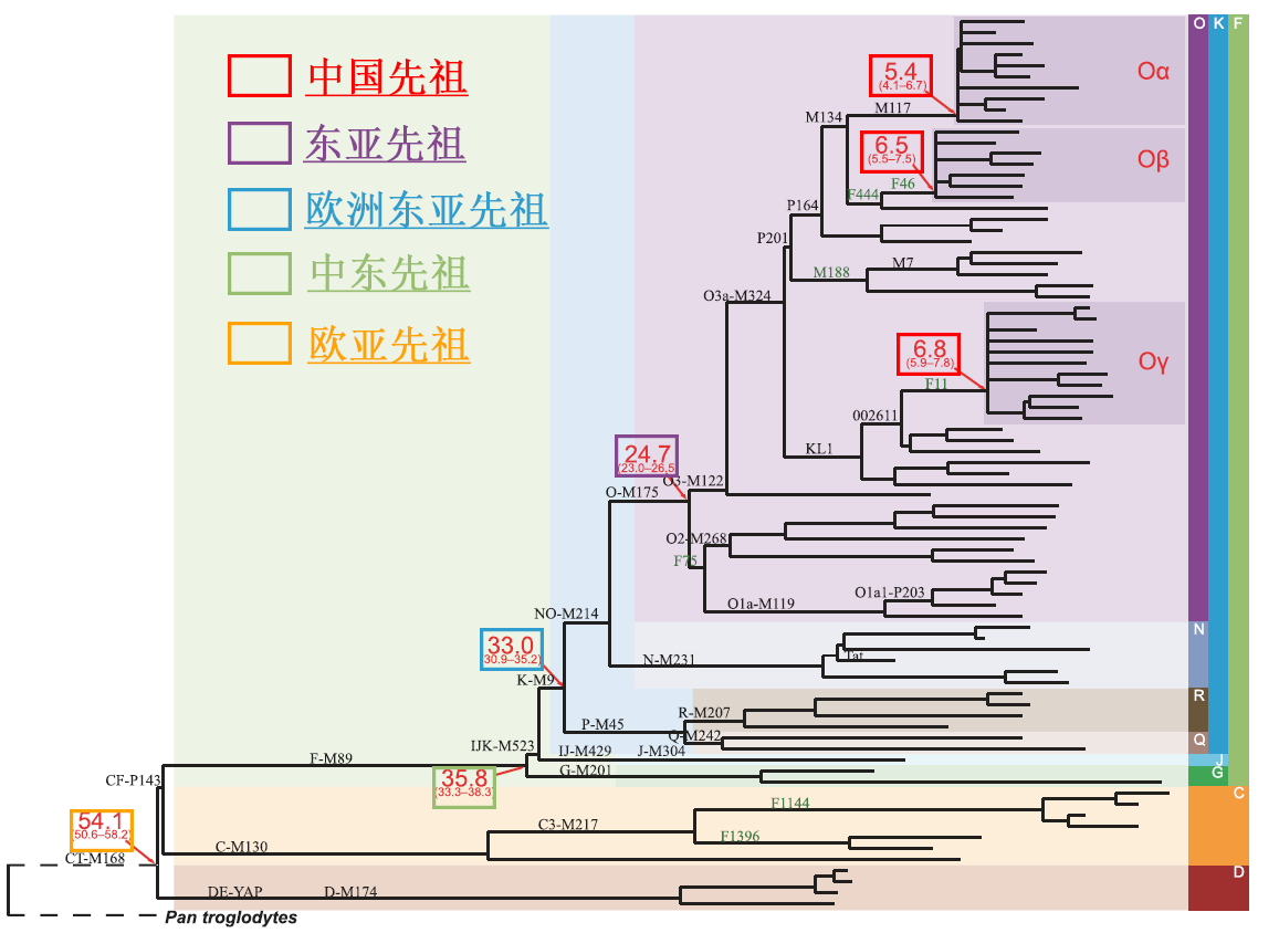 5. 24.7千年前O型(M175)在东南亚出现,即为东亚人的先祖;6. 现在40%的中国人可以归入O型的三个分支Oα、Oβ、Oγ中,他们的时间分别为5.4千年前、6.5千年前、6.8千年前。