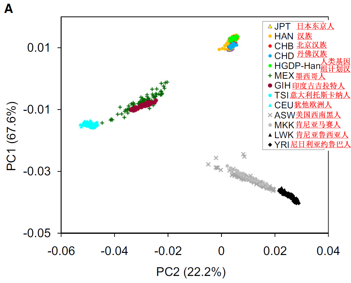 4.非洲的点分的比较开,不像汉族聚在一起,说明非洲人的基因多样性远超过汉族和欧洲人;