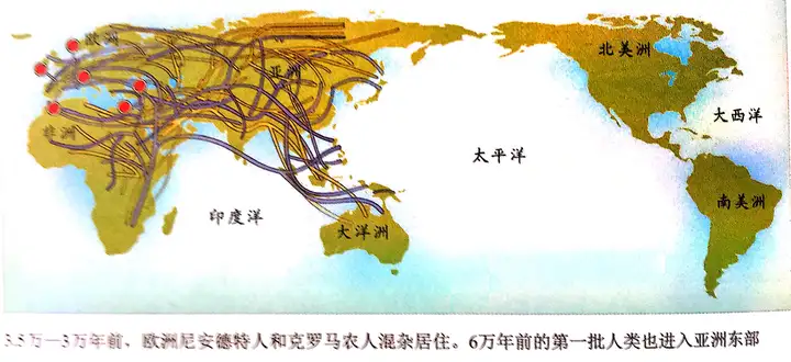 下面的图均拍自《人类六万年》,图侵删。可以看看大致的迁徙过程。