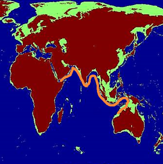 上图红色是现在的大陆,绿色是当时海平面较低(100米)时的大陆,橙色即为M130的海上高速公路。