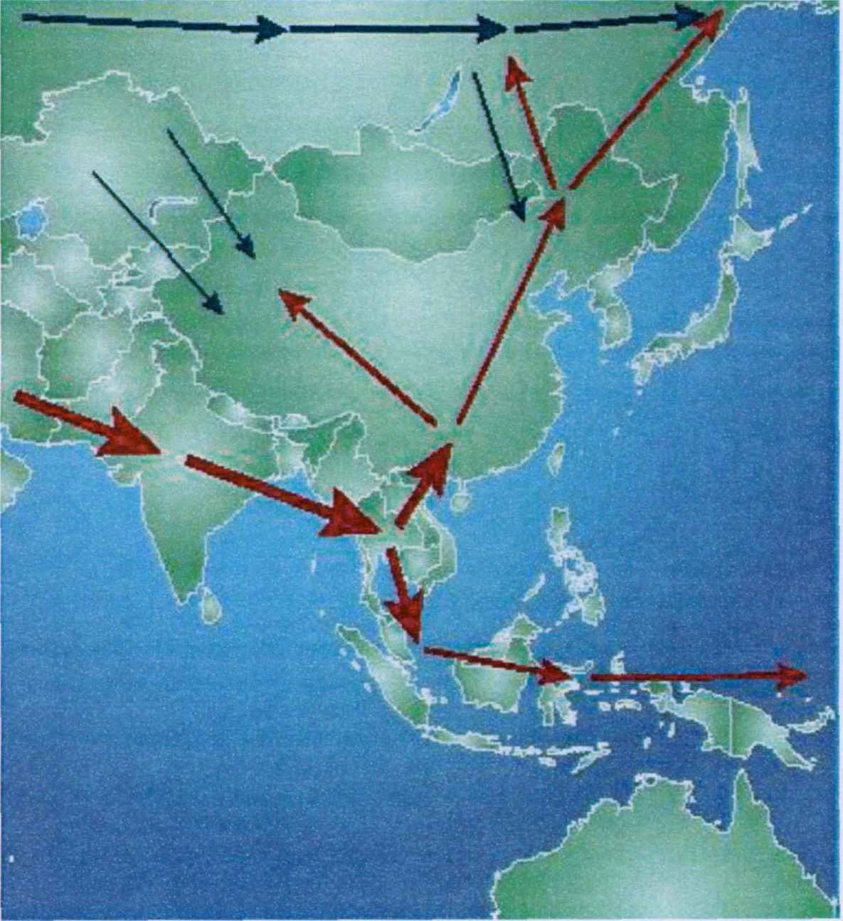 现代人走出非洲后,其中的一支在距今大约6万~1.8万年前,经南亚迁徙至东南亚,然后逐渐北上扩散至东亚大陆,有一部分继续北上经白令海峡迁移到美洲,还有一小部分则沿东南沿海从东南亚向东进入太平洋群岛;在现代人走出非洲后,有研究人员认为在较晚的时期可能有部分中亚人群从西向东迁移并与东亚人群交汇,还有一小部分则沿东北亚经白令海峡进入美洲大陆。