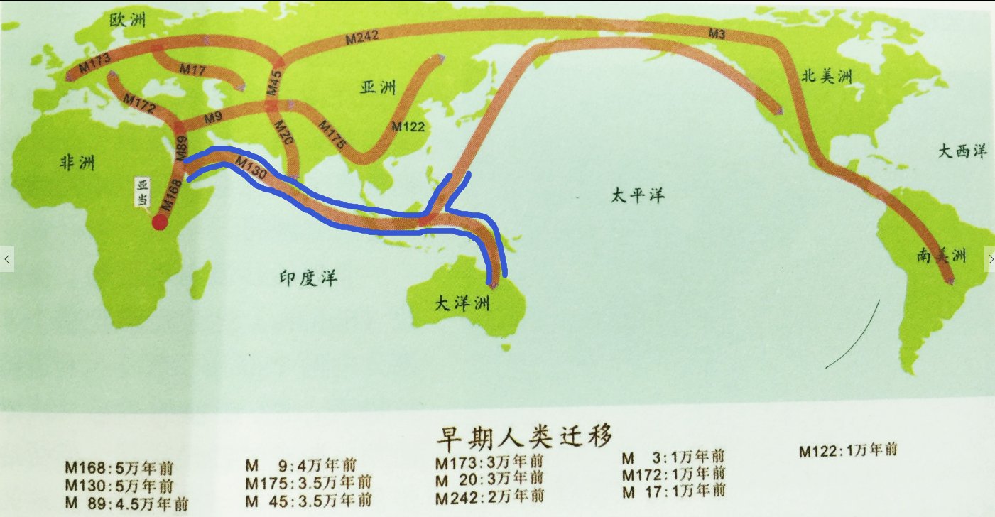 M130也就是C型(途中蓝线标出的那一支),在5万年前沿着阿拉伯半岛、印度次大陆、印尼,一路到达了澳洲大陆。(实际上D型与C型基本同样的时间,同样的路线)