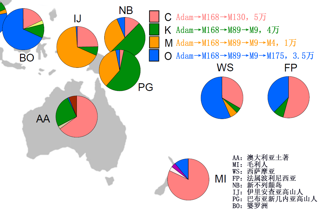为了证明上面这幅图的正确性,我要放大招了,从之前给出的Y染色体世界地图中抠出下面这张澳洲Y染色体地图————