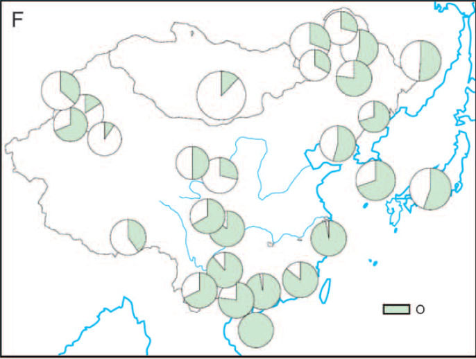 我们已经知道O型是从东南亚进入中国的,看一下东亚O型的分布——
