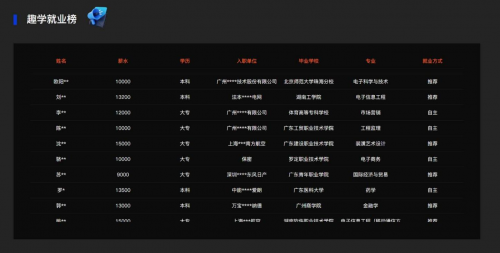 截止2022年10月趣学旅程前端开发首期班,实现100%高薪就业,最长就业周期4周,平均就业月薪¥11,860,最高就业月薪¥15,000,是同期广州IT职业教育的最高纪录。