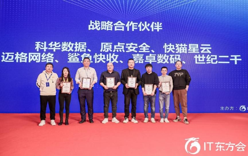 接着由IT东方会北京分会联席会长于庆龙于总和IT东方会零售分会会长冯会东冯总为战略合作伙伴颁奖(科华数据、原点安全、快猫星云、迈格网络、鲨鱼快收、嘉卓数码、世纪二千)。
