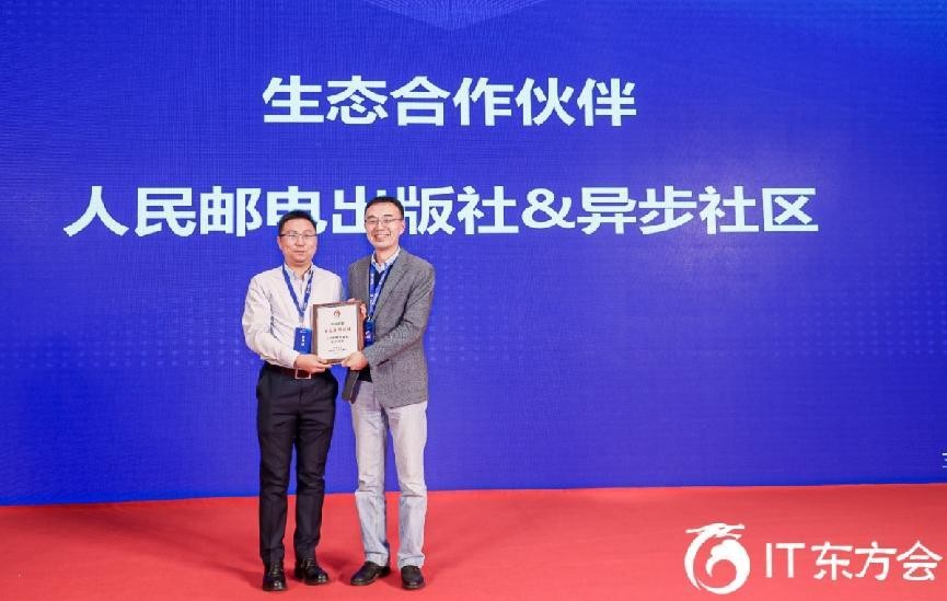 首先由IT东方会联合创始人王迪先生颁发的是生态合作伙伴奖(人民邮电出版社&异步社区)。IT东方会的发展离不开人民邮电出版社的支持与见证,尤其是在帮助各位专家著书、宣发等方面。