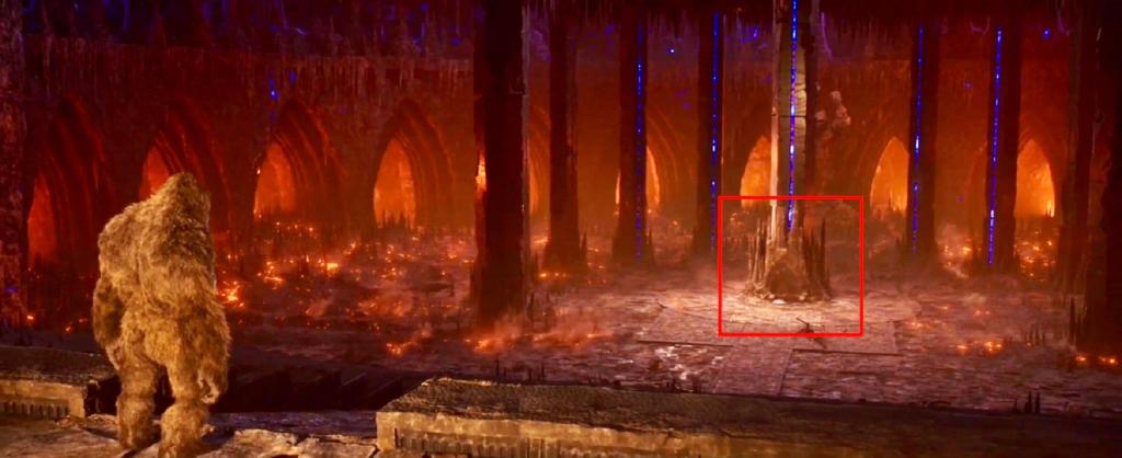 其一可能是一只远古时期被打败的哥斯拉金刚把它的外表皮剥下来进行加工,填充到王座旁边,做成了一个哥斯拉的图案,用来吸收并且储存地心原子能量。