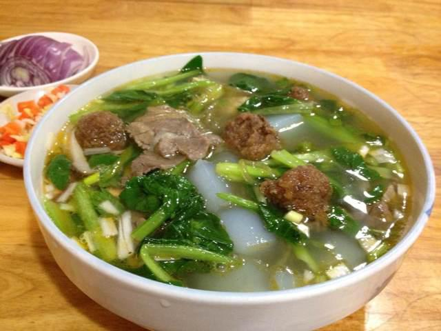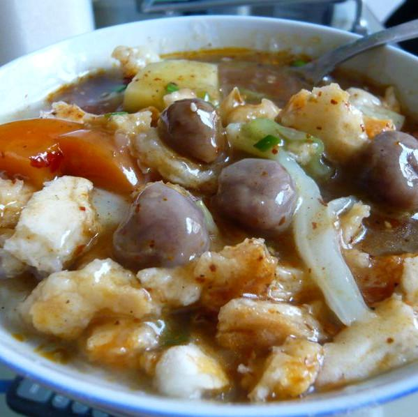 丸子汤的汤一般是把牛肉和牛骨头熬制很久而成, 丸子是用新鲜牛肉入料,炸熟炖到汤里,外脆里嫩。混着吸足汤汁的冻豆腐、阿魏菇、牛肉片、粉块、粉条、鲜蔬菜等,口感十分丰富。