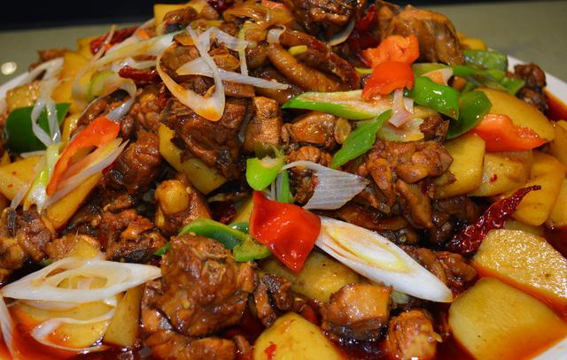 新疆大盘鸡分为沙湾大盘鸡和柴窝堡大盘鸡两种,沙湾大盘鸡带有浓稠的汁,吃完后上皮带面蘸食。柴窝堡大盘鸡是将鸡块用油炸透后,用朝天椒干炒而成,更有嚼劲。 新疆大盘鸡属清真小吃,因用大盘盛装鸡块而得名。