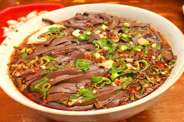 整个四川人人皆知。色泽红亮,质地软嫩,口味麻辣浓香。观之青红碧绿,津河暗涌。一大青瓷盘新拌的肺片端上桌,红油重彩,颜色透亮;把箸入口中,便觉麻辣鲜香、软糯爽滑,脆筋柔糜、细嫩化渣。