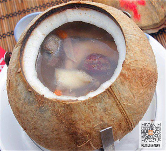 广州气候湿热,因此人们十分注重膳食养生,炖品就是其中一个突出代表。椰子炖品以椰子壳为器皿、椰子水为汤汁,原汁原味,椰香味、肉香味,香气扑鼻。