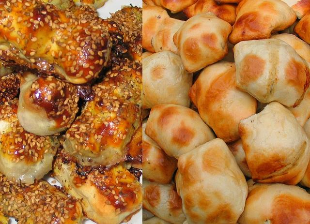 烤包子(“沙木萨”)是维族人喜爱的食品。烤包子主要是在馕坑中烤制。包子皮用死面擀薄,四边折合成方形。包入羊肉丁、洋葱、孜然粉、等原料做成的馅,馕坑中烤熟。
