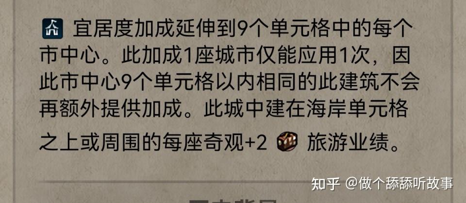 有一些文明会拥有自己的特色区域与特色建筑,他们会取代原先区域/建筑,并拥有更棒的效果。文明我后面会专门说抛开有些文明的特殊情况,所有区域(包括市中心)都有给旁边区域“带来少量(0.5)相邻加成”的功能(除了市政中心,它+1)。我没有在下面好处里面写这一点,但希望您能明白这一点。有些文明的特色区域或者技能,能享受更大的加成。