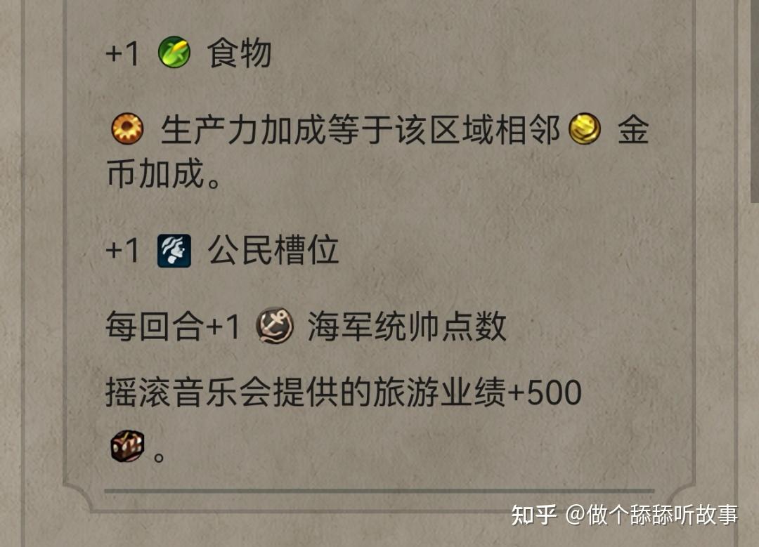 如果你修保护区,可能需要注意这一点部分区域影响“摇滚乐队旅游业绩”,但这个是影响别的文明收益的!所以我没说区域分别介绍