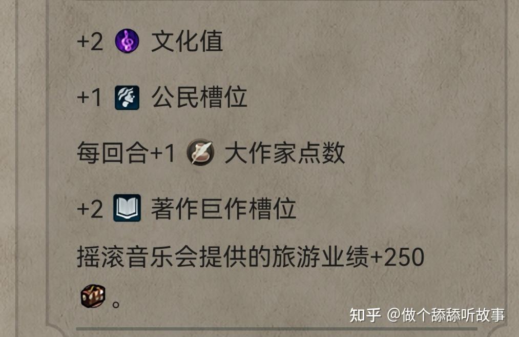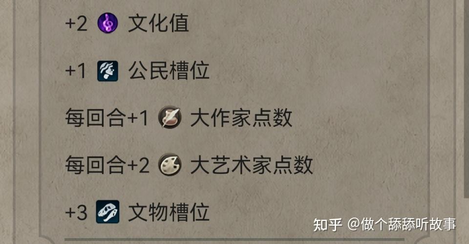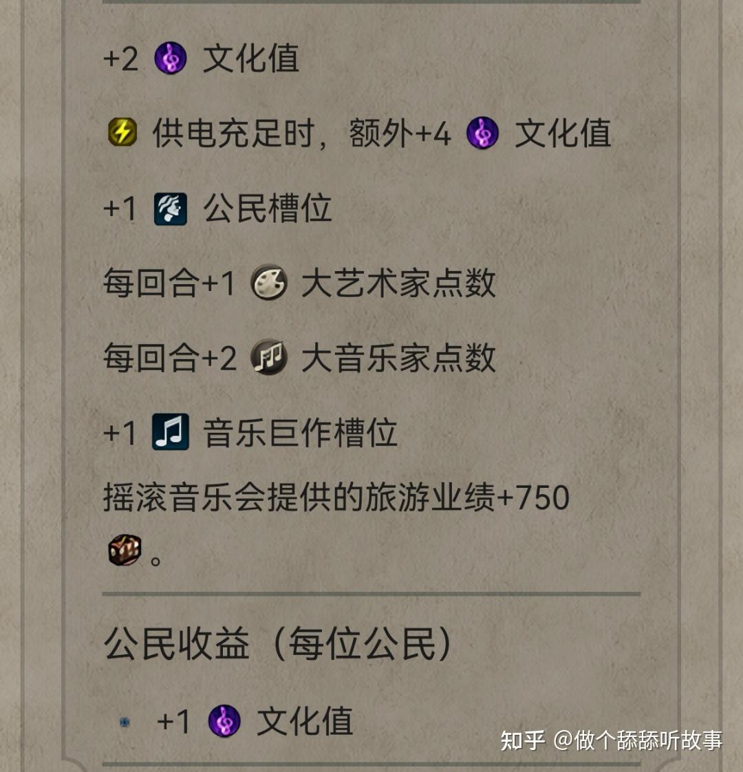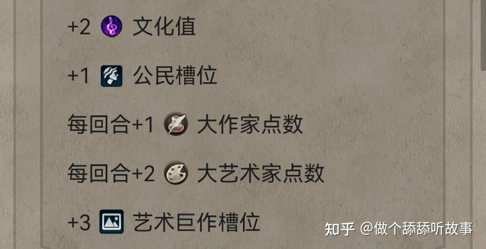 文化值,大作家/艺术/音乐点数公民工作位置buff:加周围一圈1魅力重要性:必备