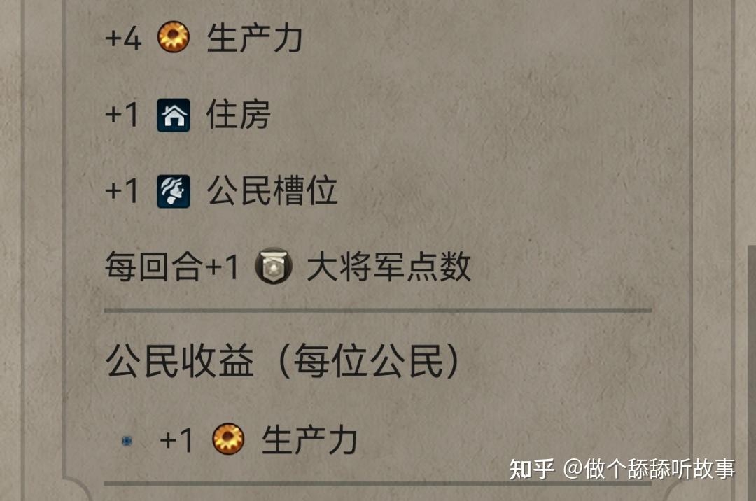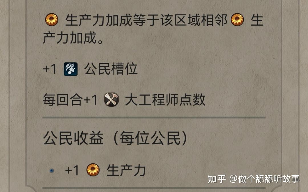 具体不同文明的例子我会在后面细说所有区域,能带来的长远好处是:我们在对应的科技/文化解锁后,可以在里面修对应区域的对应建筑。我没有在下面好处里面写这一点,但希望您能明白这一点区域分为特色区域/普通区域。我们主要要记住:特色区域的修建受到人口限制。