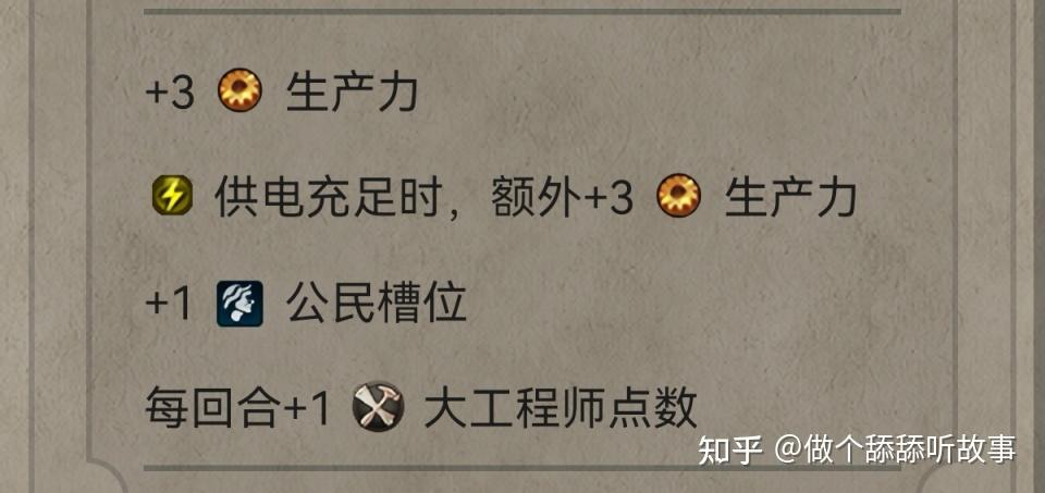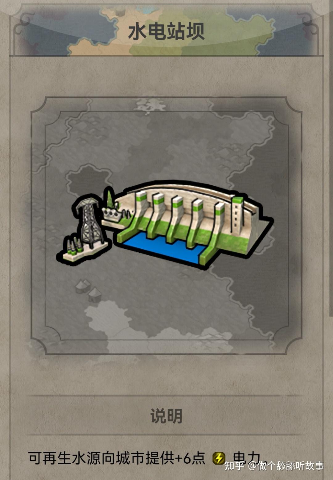 buff:周围一圈魅力+1免洪水/免干旱住房+3宜居度+1电力+6一级建筑水力水电站坝提供为工业区额外提供+2重要性:一般