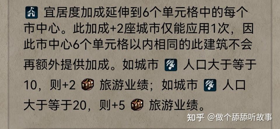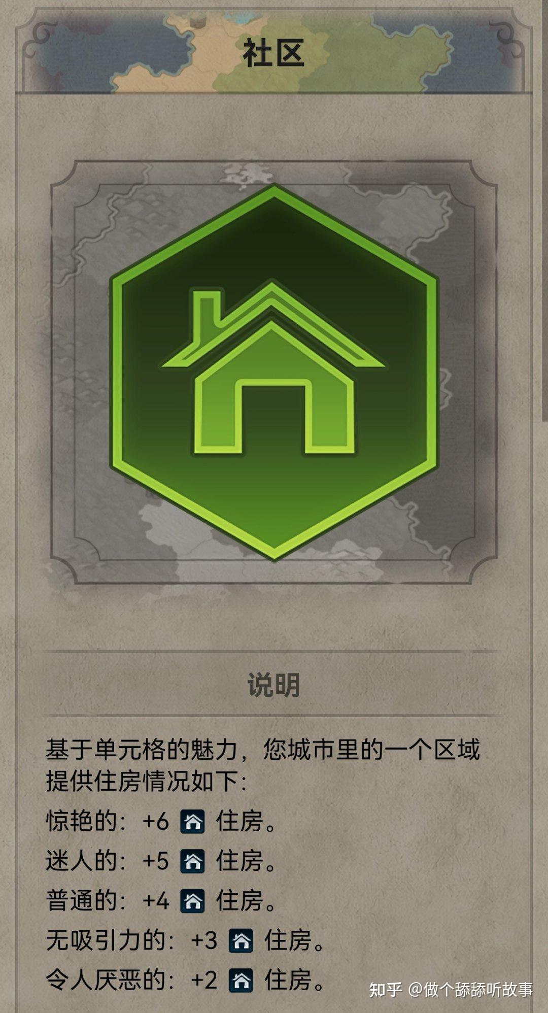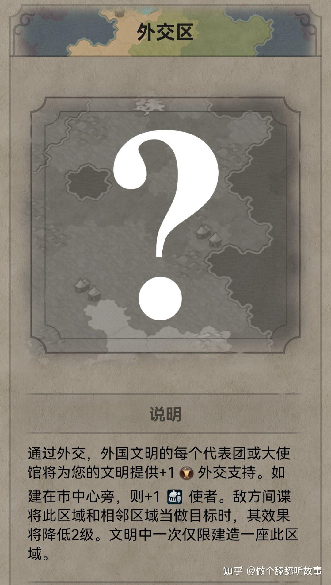 人口限制后面细说特色区域里有俩种区域整个文明只能修一个是:市政广场和外交区城市拥有的区域,会影响到商路收益。