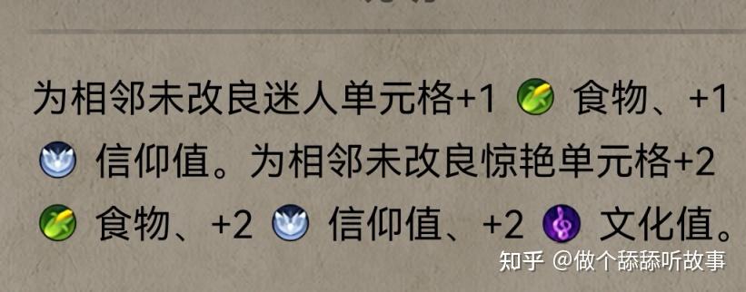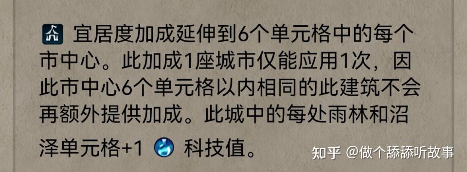 buff:周围一圈魅力+1文化炸弹周围一圈地直接拿来,不用买地 住房数量根据魅力而定食物/文化/信仰一级建筑“古树林”根据魅力提供科技/金币/生产力二级建筑“避难所”根据魅力提供重要性:无所谓